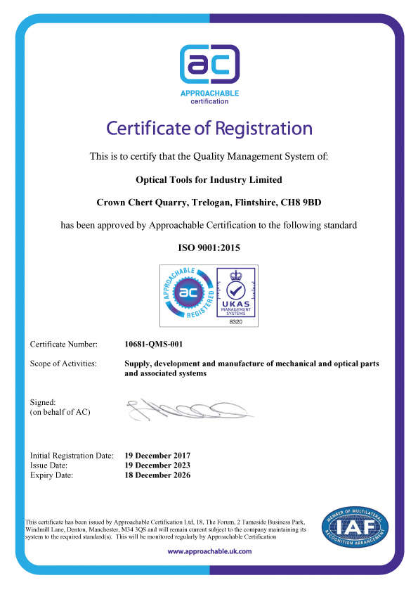 Optical Tools for Industry operates in accordance with ISO 9001 quality management principles, demonstrating our commitment to consistent processes, continual improvement, and customer satisfaction. ISO 9001 is an internationally recognised standard that ensures organisations maintain effective quality management systems, control operational procedures, monitor performance, and prioritise customer requirements.